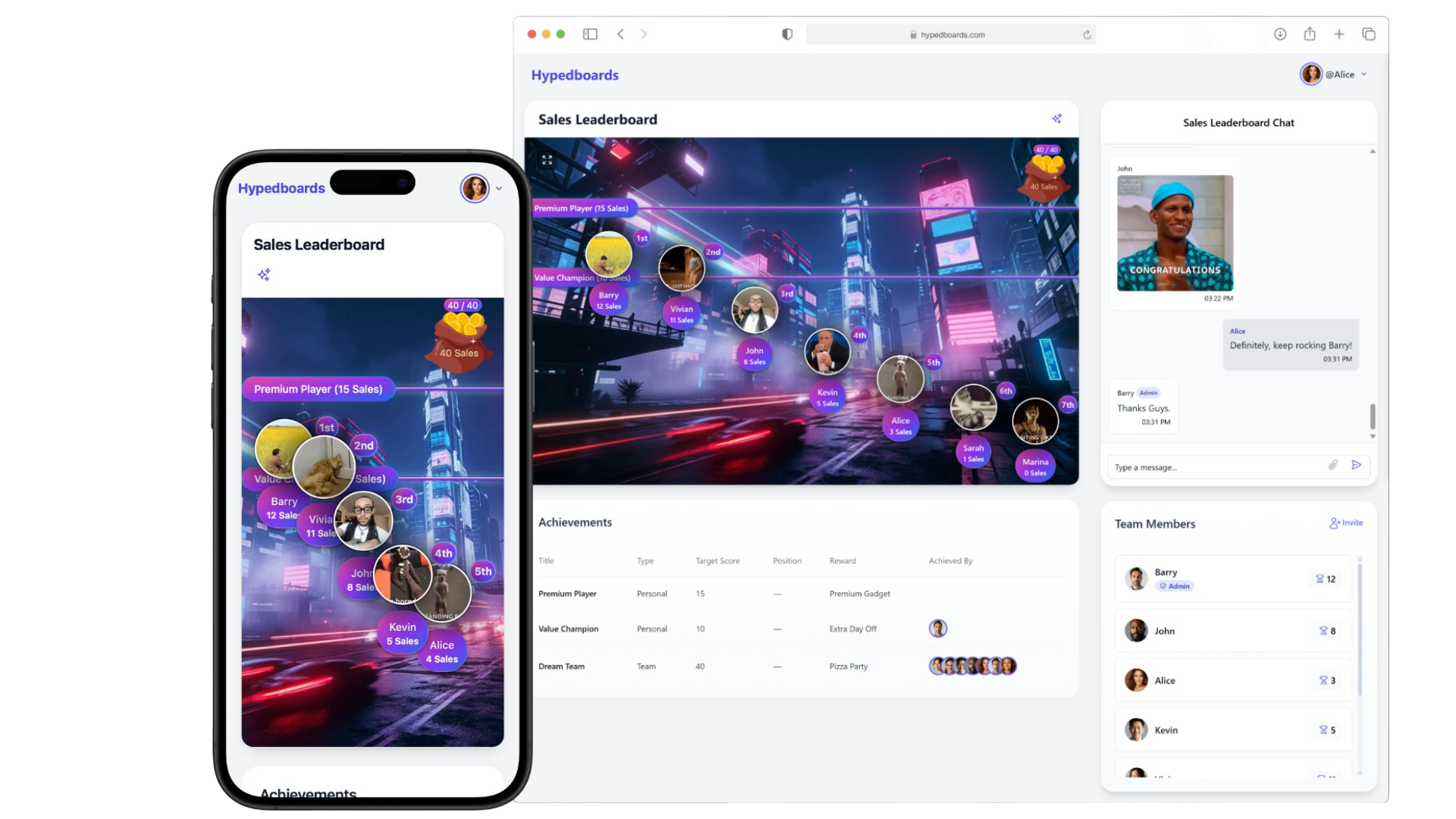 For Call Centers: Put the action on the big screen! Live leaderboards display everyone's position while the chat explodes with automated celebrations every time someone closes a deal. Watch your sales floor transform into an electric competition arena.